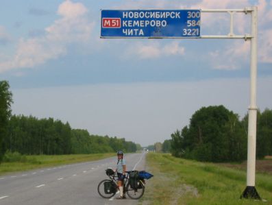 We joined the main trans-Siberian highway 90km east of Tumen, although I would recommend anyone going from Ekaterinburg to Omsk to go via Kamensk Uralski and not by Tumen as there is less traffic that way. From there we rode east via Omsk to Novosibirsk, then detoured through Altai, Tuva and Kharkassia. We joined the trans-Siberian highway again in Irkutsk and rode it to Ulan Ude and then headed to the Mongolian border. The traffic was quite light except for within 50km of the cities. The road was reasonably surfaced and wide enough for a least a car, a truck and a bike to pass safely. We don't like traffic but we were happy riding it. There are cafes at least every 70km and we stopped bothering to buy, cook and carry food and just bought our meals. $4 bought soup, tea and a main meal for two people. We found that the wind blew from the west when the weather was cloudy or wet, and from the east or north when it was good. A few of the cafes appeared to have rooms for rent but we camped most nights. Good places to camp are easy to find. The mosquitos were pretty bad in the forest so we tried to camp in the open, but out of sight of the road. A head net, mosquito coils (hard to find locally) and mosquito repellent (easy to buy locally) are essential.