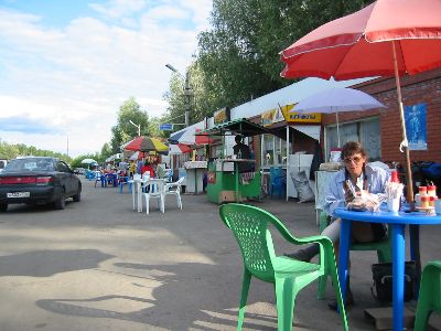 Russia is a strange country in that some things seem quite cheap and others are disproportionately expensive. So two people can eat well in a cafe for $5, but a hotel room in a big city will set you back $40. An equally good room in a small town in the provinces will cost $10-$15. Many people earn as little as $50 a month and get by only by growing their food on their "dacha". This works for them because food is surprisingly expensive, a kilo of potatoes costs a dollar - making the cafe meal seem even better value. We spent about $10 a day ($5 each) between the cities, and thanks to friends who found us cheap places to stay, about the same in them.