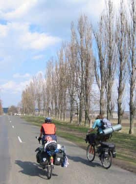 The roads are quite good, at least if you stick to the more important ones, and all but the biggest are pleasantly quiet. The standard of driving is not very good though, with oncoming vehicles frequently overtaking as they pass and trucks expecting cyclists to pull onto the verge if they need space to overtake. Good maps at 1:500,000 scale are widely available from petrol stations for a dollar each (see www.ukrmap.com.ua). The IGN map available in the UK is wildly inaccurate. On the 1:500,000 maps we found the biggest classification of road (orange) to be a little too busy for our taste, the next two grades (pink and grey) to be ideal, and the yellow roads to be good while they were asphalt but they were frequently cobbles, gravel or even dirt.