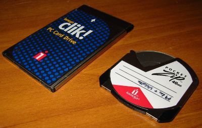 For backup and sending files (digital photos and website updates) home, I have an Iomega Clik disc drive (also called Pocket Zip). This fits entirely within the PC card slot and takes discs about the size of a 2 euro piece. Each disc holds 40Mbyte, enough for around eighty photos. The discs are quite delicate, but they come in robust plastic cases and none have failed yet. The alternative would be a heap of medium sized (say 64Mbyte) Compact Flash cards, which are a bit more expensive but the adapter for the PC card slot is cheaper and they would fit straight into the camera if the computer was to fail.