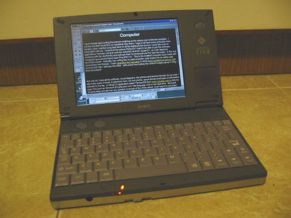 I spent literally days surfing the internet weighing up the various sub-notebooks available. I wanted one that would fit in my handlebar bag where I hope it will have some protection from vibration, plus I wanted a big hard drive for all the digital photos and so I could take a lot of information with me. I looked at the various PDAs but I want to be able to use the software applications I've been using at work like AutoCAD and MS Visual C++, so I can diagnose problems with the electronics and software that I've produced over the past few years. In the end I snapped up a second hand Casio Fiva MPC-101. This is the smallest computer every made with an SVGA screen. Naturally I am writing this on said computer, while folded into an airline seat somewhere over Europe. I have upgraded the hard drive to 30Gb (and installed a dual boot OS) so if one OS fails I still have the other. With a four hour battery the while lot weighs about 1100g, I think it's brilliant!