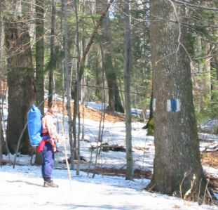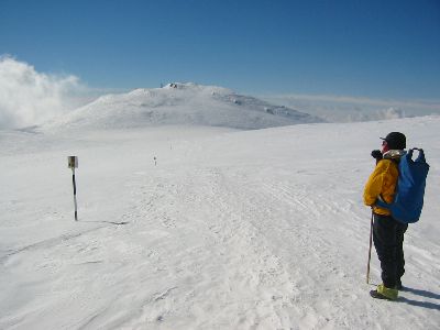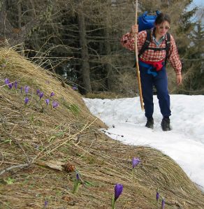 We started out in woodland. The trees were daubed with blue and white paint so it was easy to find the way. Higher up we passed crocuses flowering where the snow had recently melted from the ground. Also at this point we crossed the rather ominous debris of recent avalanches. Then we were above the trees and on to a flatish expanse of featureless snow. At which point the wind got up and it began to snow...
