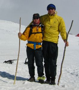 We got to the cable car station mid-morning but the sun was softening the snow and making walking hard work so we thought we'd best go down. At the bottom we found a ski hire place which hired us skis and boots for $3 for half a day. So duly equipped we went back up. Ju had done a fair bit of skiing abeit some years ago, while I had no idea. So Ju very patiently taught me the basics and I spent 50% of my time lying in a heap in the snow, cursing the ridiculous planks that some pillock had persuaded me to strap to my feet. Actually by the end I was starting to enjoy it as long as I was on a virtually horizontal piece of snow.