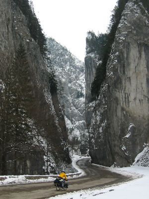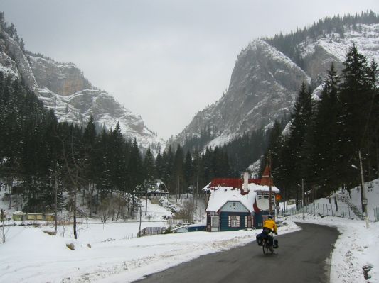 Next day was a little sunnier and we had an easy day downhill into Gheorgheni, cycling over packed snow on the pass and then slush or tarmac lower down.