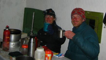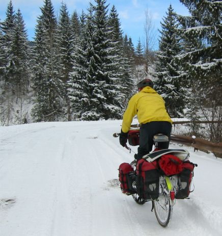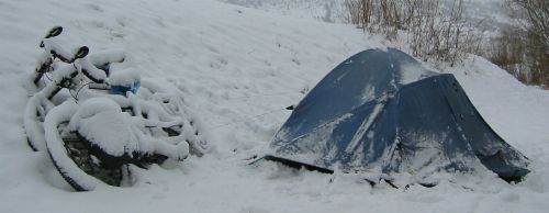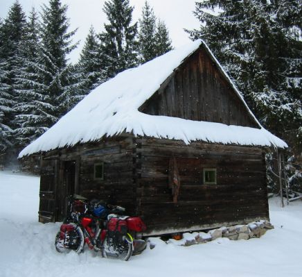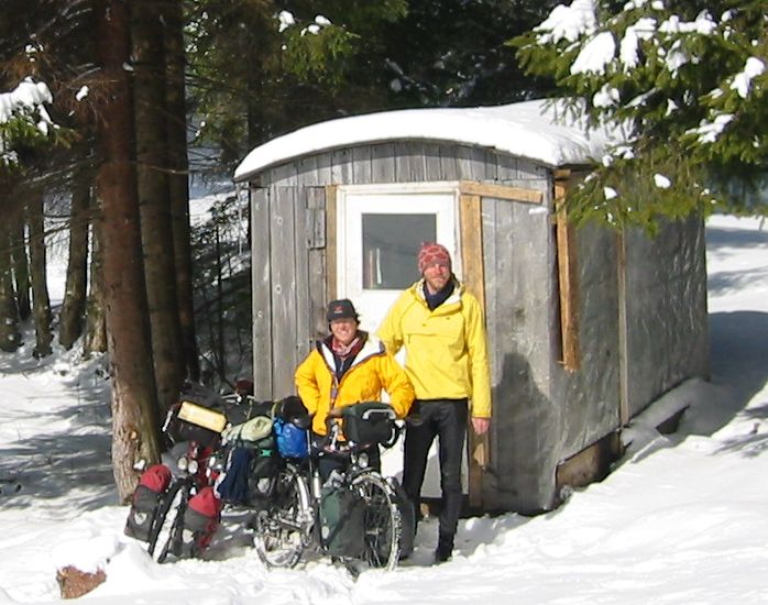 That day we had a high pass to cross, but progress on the snow covered road was slow and by 5pm we had only just reached the top of the pass. Luckily there were some holiday cabins near the road and we found one which had been left open. It was really just a garden shed with a table and some beds you wouldn't want to sleep on, but it gave us shelter from the wind and snow.
