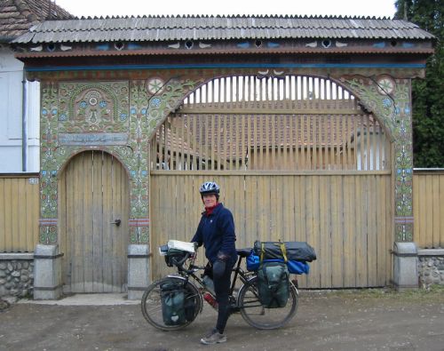 This part of Romania is called Szekely Land, it is inhabited by people of Hungarian origin and is quite different to the country to the south of the Carpathians. The ribbon development disappeared and the villages seemed tidier and a little more afluent. We much prefered the cycling here to that between Giurgiu and Sinaia. Many of the houses had beautiful carved wooden gateways such as this one: