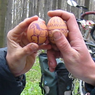 We met Vlad, a student from Kiev, at the end of the 26th. He had heard about us through a Ukrainian cycling website (www.velocity.ua) and come by bus from Kiev to meet us. He spoke fluent english and helped us enormously to communicate with the local people and learn about Ukraine. It was Easyer Sunday in the Orthodox Church so Vlad had brought us an Easter bread and showed us how to crack eggs in the traditional Ukranian fashion. The forest where we camped was carpeted with flowers.