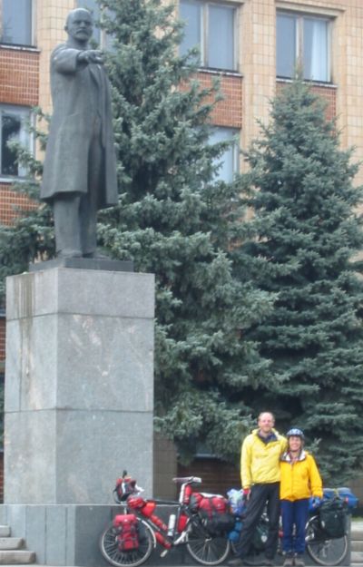 A little further on we passed our 8000th kilometer (5000th mile). To escape the rain we decided to go to a hotel that night, opposite this fine statue of Lenin. Everywhere we went there were statues of Lenin and other local leaders. We also often saw old tanks, fighter planes, jeeps and even a tractor on pedestals. |