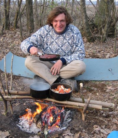 That evening Vlad showed us how to make a fire. He dug a shallow pit to contain the flames and protect them from the wind and we cooked our dinner over it, followed by endless cups of tea. We had bought a very tasty Ukranian salami sausage and washed it down with Ukranian unfiltered beer. |
