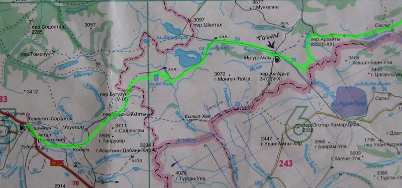 Mugur Axy has a basic hotel (diagonally opposite the police/military building) and a profusion of shops, most selling the same things. In the shops by the hotel we found cucumbers, cabbage, tinned tomatoes, sausage and dried fish. There are two roads onwards from Mugur Axy, the car road, which goes south over at least one pass, and the horse road which goes south-east down the valley from the petrol station. On a bicycle the horse road is the easier, after about 18km you will come to the properly built dirt road along which all supplies go to Mugur Axy and Kyzyl Khaya (mostly coal). It is severely bumpy and rocky, but the scenery is good and if you get fed up with it, it is very easy to hitch a lift with the many empty coal trucks heading east (make sure you tie the bike down well and pad any contact between it and the truck). If doing this route from east to west, the horse track to Mugur Axy leaves the dirt road at the foot of the steep pass, just past Km 28 (Km 128 if coming from the east).