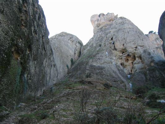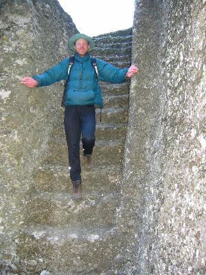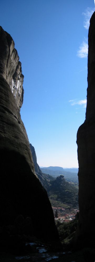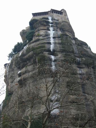 Meteora is place of amazing rock formations, topped by even more amazing monastries. We were blessed with perfect clear cold weather for the first of our two days there. Monastries and frescos are all very well, but firstly we went scrambling on the rocks. It was a bit dicey because the SPD cleats make the soles of my boots slippery and Ju's boots are two sizes two big so she can get lots of thick socks in them. This gave us a feeling of what it must have been like to be a monk searching for a new cave to meditate in! We came to some beautifully carved steps in one place, leading to a cut traverse ledge that led to a viewpoint over Kalambaka. Believe it or not this was halfway up and otherwise pretty difficult scramble! The rock scenery is fantastic, and in places it was encrusted in icicles and ice smears. |