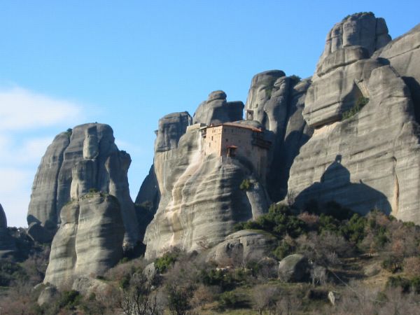 Next day we went to a Monastery. There are six active monastries, all of which date back to around 1400 AD. They are mostly famous for their frescos. As far as we could see these consisted almost entirely of pictures of saints being martyred. No saint was complete without a painful end! All the monastries are on pinacles or cliffs to make them inaccessible. Originally supplies and visitors were hauled in with winches, but now they have steep stairways. Here we have the monastery of Ayiou Nikolaou Anapavsa on the left and the more imposing Varlaam on the right: