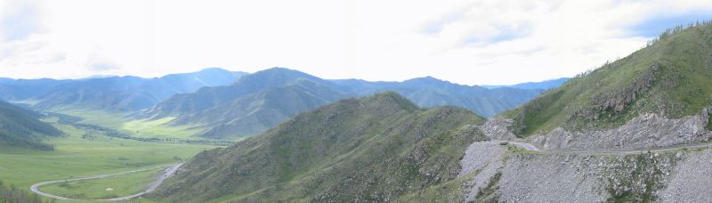 This is looking back down the first and biggest pass on the Tract, the Seminsky Pass, 1800m.The top of the pass was not very exciting, there is a sport hotel with cross country skiers practising on roller-skis and a cafe-van selling shashlik (meat grilled on skewers) and tea. Not even a sign with the height of the pass for a "pass photo".