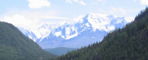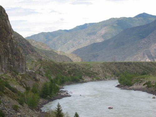 Once over this pass we rejoined the main river. The road was now running through a gorge, and the mountains were getting higher. The dot in the river in the photo below is a party of rafters. The trip from here to Chemal takes six days, slightly slower than cycling!