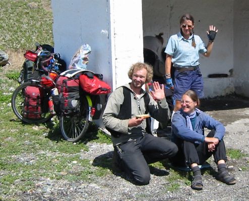 After leaving the hikers we passed the military base in Aktash and then climbed part way up a small pass. A thunderstorm arrived and was soon pelting us with cold rain while thunder rolled around the cliffs. We were very glad to reach a picnic place with a covered pagoda and piled into shelter as quickly as possible. There was a party of Russians in the pagoda, but they made us welcome and shared their vodka with us. It transpired that they were military people and when we said we wanted to cross the mountains from Kosh Agach to Tuva they asked if we had the necessary permission. We produced the piece of paper we'd been given in Gorno Altaisk and only then learnt that it was not a permit at all, but a receipt for registering our visas!