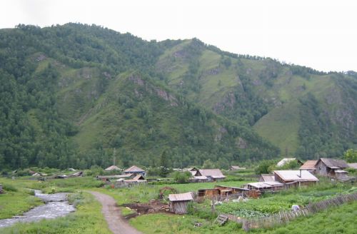 About 50km further on the Chusky Tract road leaves the main river and follows a tributary, most of the traffic is tourists and rafters and they all follow the main river by the road to the rafting centre of Chemal. The Chusky Tract was blessedly quiet from there on. This is the village of Meota where we bought food and were given potatoes, onions and milk by local people. Throughout Siberia we found that the shops do not usually sell fresh food, but that local people were often happy to.