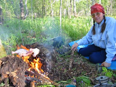 The Urals were very green, the sun shone and the roads were smooth and quiet. We had a brief spell on the main Ufa - Chelabinsk road which was horrible, too narrow and too busy, but apart from that the roads seemed perfect for cycling. Here is Ju roasting chicken legs for our dinner one evening: