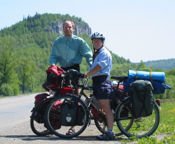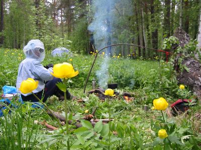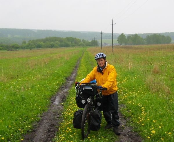 To make matters worse it was pouring with rain and the mud clogged our wheels. We ended up camping in the forest nearby and continuing the next day when the rain had stopped. The other problem we had is that each day the mosquitos got worse. The campsites were idyllic, often in meadows of globe flowers, but they were always damp and there were always hordes of mosquitos. (At least we thought they were hordes at the time - it was much worse in the Siberian taiga)