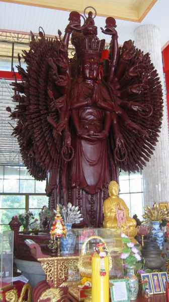 About 200km from Kanchanaburi we were looking for water for our night's camp. We rolled into a place that looked like a cross between a government office and a tourist attraction and found ourselves in the "God House Resort". The people there were extremely friendly, first they gave us ten litres of drinking water, then we were invited to visit their star attraction, the wooden statue of the deity "Kuan Sin" with one thousand arms. After that we were treated to a free meal at the vegetarian restaurant. We noticed a couple of small fields surrounded by toilet blocks and asked if they were campsites. In response we were invited to sleep in the Wat (Buddhist temple) or camp outside it. We felt it too much of an imposition to sleep inside and instead pitched our tent on the nicest grass for a long time. We drifted off to sleep to the sound of monks chanting and were awoken at 4:30am (only half an hour before our usual time) by the tolling of a bell and more chanting. |