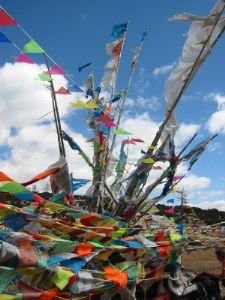 For a few happy kilometers the road ran flat across a dusty plain dotted with grazing animals, then it was up and over a low pass, topped by a monastery and overlooked by a hill bedecked with prayer flags.