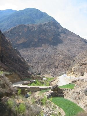 From Derong the high passes were over, but for 80km we had to endure a bumpy dirt road (hopefully soon to be surfaced, see Cycling in Sichuan). How we love tarmac! We joined the Yangtze and witnessed Chinese road crews blasting new roads along its precipitous sides and building a bridge. On the second day we discovered that an annoying squeaking was due to Mark's front rack having cracked. Luckily it wasn't serious and could be temporarily repaired with a toothbrush!