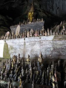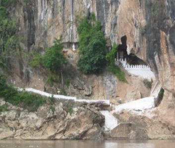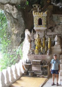 Our two days in Muang Ngoi Neua were over all too soon and it was back on the bikes to ride south to Luang Prabang. We were blessed with a day of heavy, cooling rain, and covered 80km to a village near the Pak Ou caves. Here we had a day off to visit the caves, where people have been leaving offerings of Buddha images for about 500 years. The caves are across the Mekong river and accessible only by boat. On the way Ju was delighted to find a millipede 20cm long and thicker than a finger. |