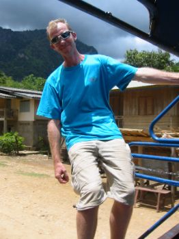 From Pak Mong where we left our bikes to the village on the road where the boat sailed to Muang Ngoi Neua, we took a sawng-thaew (literally "two-rows"). This is a pickup truck converted to have row of seats down each side and a simple awning to keep off sun and rain. If it gets too hot inside you can hang off the back for a cooling blast, as demonstrated by Richard! |