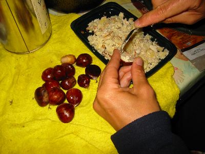 Sounds nasty, but works well. Boil the chestnuts whole over the tranja for 10 to 15 mins. Throw away the water. The next bit takes a while. Hollow out each nut with a teaspoon, or if you have any nails (Idon't) then peel them.