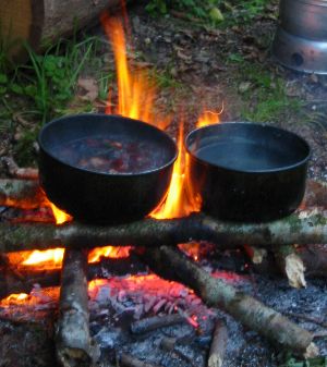 The next stage is to reach the cones. (Spot the English cone hunter). A local man told me that the Russian Army bang the tree using 6 strong men and a spare tree trunk. Lacking the men they dynamite the tree base. We however saw local men gently swaying in the tree tops picking the cones. The cones are covered in resin. One local person told us that we should boil them to remove the resin, but better I think is to roast the whole cone over the fire on a toasting rack. The nuts come out more easily then. Each cone takes about as long to eat as an lobster. |