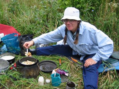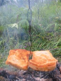 Josie Dew and other notable cycle tourists rave about the joys of porridge for breakfast, but for me no sticky mess can compare with crisp toast, cream and honey. Mark has used his plier-like grip to shape a bit of steel wire we found into a toasting rack. It is also good for grilling fish. The rack has two butterfly wing loops , with the end bent upwards to form a hook. The upright hook must be long or the rack tilts too much as you take the first piece off, throwing it's partner onto the coals below. |