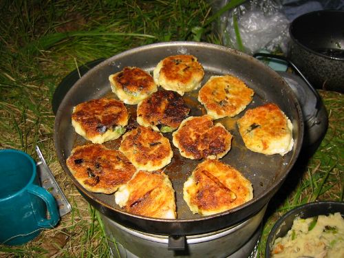 Potatos are very expensive to cook on the Trangia in terms of meths and water needed not to mention pedal power to transport. I like to have them every so often however on a long tour as they have vitamin C that rice or pasta lacks. So I always cook a pan brimming full of them. The left over ones get mashed and put in a box. In the morning mash with any sort of tinned fish and other left over veg, coat in flour and FRY.