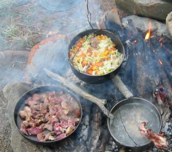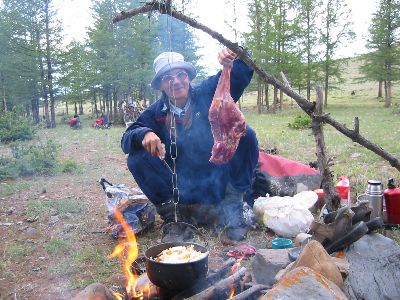 We got this leg of lamb from a trader selling one freshly buchered sheep at a market in the Altai mountains. Much hacking up was needed to get it into the pot. Being a biology teacher I was reminded of dissections and made investigations of knee and elbow ligaments. This did not in any way reduce the pleasure of eating it. We had it fried, grilled, souped and casseroled. Mark applied some stone age technology to the bones to fit them into a pan to make boullion. All 3 kg came for less than price of 3 kg of potatoes. There are lots of sheep here.