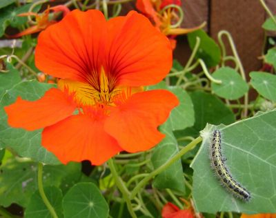 Nasturtiums growing in Ju's parents' garden. It is better not to pickle the caterpillar!