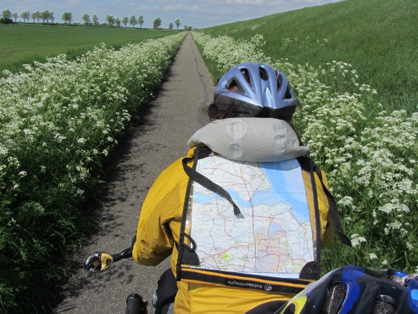 It took a bit of jiggery-pokery to get my saddle high enough and Julie's low enough (I am 6'2" and she is 5'2"). As well as a very long seat post I have an extension brakcet under my saddle which lifts it and moves it backwards about 50mm. Julie meanwhile has 160mm cranks to bring the pedal up a bit (she would normally have 165mm) and we modified her saddle clamp with a file to save a few more millimeters. It is a stiff frame (it's a double marathon design - two diagonal tubes) and has wide pilot's bars, it probably wouldn't work otherwise. We think it is great way to have a tandem, this is the view I get from the back:
