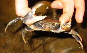 Freshwater crabs seen in Khao Sok, Thailand. The right hand one is a cave dweller: