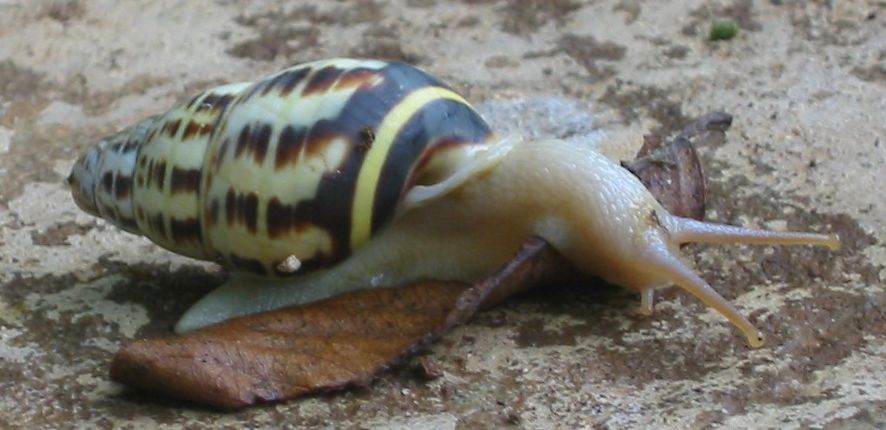 A snail devours a leaf by the Pak Ou caves:
