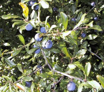 Sloes grow on blackthorn bushes which may be found in many British hedgerows. They look like this: